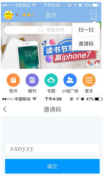 用户可通过扫描二维码或在手机的“应用商店”中搜索“学习通”将“学习通”APP下载至手机, 点击新用户注册,输入手机号,或者邮箱,获取验证码,输入密码。确认密码之后注册成功。点击首页右上角的“邀请码”,输入“sxnyzy”,即可在手机上进入超星电子数字图书馆,对电子图书进行检索、阅读及下载。