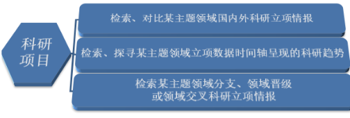 “海研”是科研项目查重查新、获取更高级别范围的立项竞争性情报的有效工具。海研以项目视角、成果关联,构建了一种新型的学术研究路径。具体功能如下图: