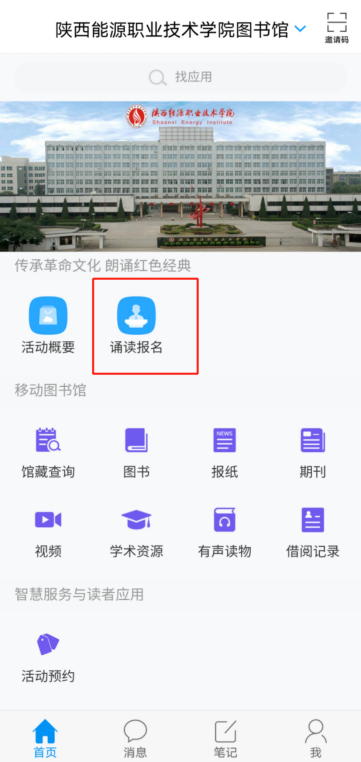 第三步,进入移动图书馆界面点击“诵读报名”。
