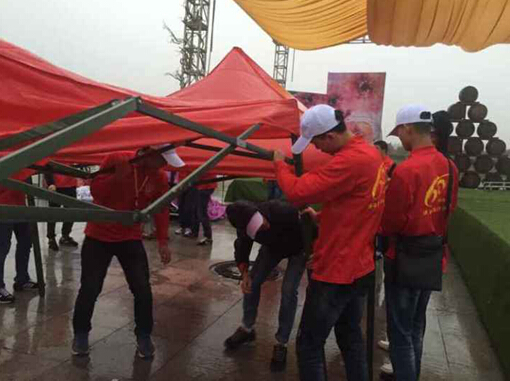 活动当天秋雨连绵,志愿者抵达活动场地后顾不上休息,迅速在活动现场搭建了40余顶帐篷为活动顺利开展提供了保障。