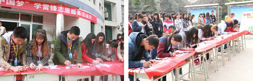 在签名环节,团委老师和各系团总支书记带头签名,在老师的带动下,全体学生陆续上前签下自己名字,也签下了自己雷锋行动的承诺。本次学雷锋签名活动作为整个学雷锋志愿服务活动月系列活动的启动仪式,为雷锋月正式拉开了序幕。