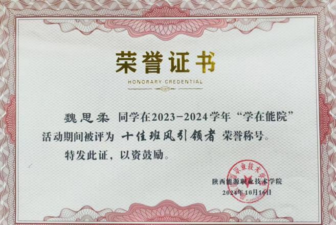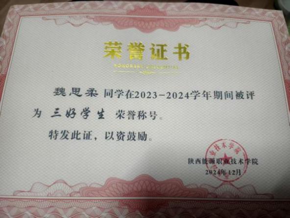 回顾成长,魏思柔步伐坚定;展望未来,她初心如磐。她将继续以积极向上之姿,在思想上追求更深领悟,在学业上朝着更高学历奋进,在工作中勇攀新高峰。正如一颗饱满的种子,她在陕能院的土壤里扎根、发芽,未来,也必将朝着梦想方向,长成参天大树,用奋斗之果,回馈校园,照亮更多青春前行的路。