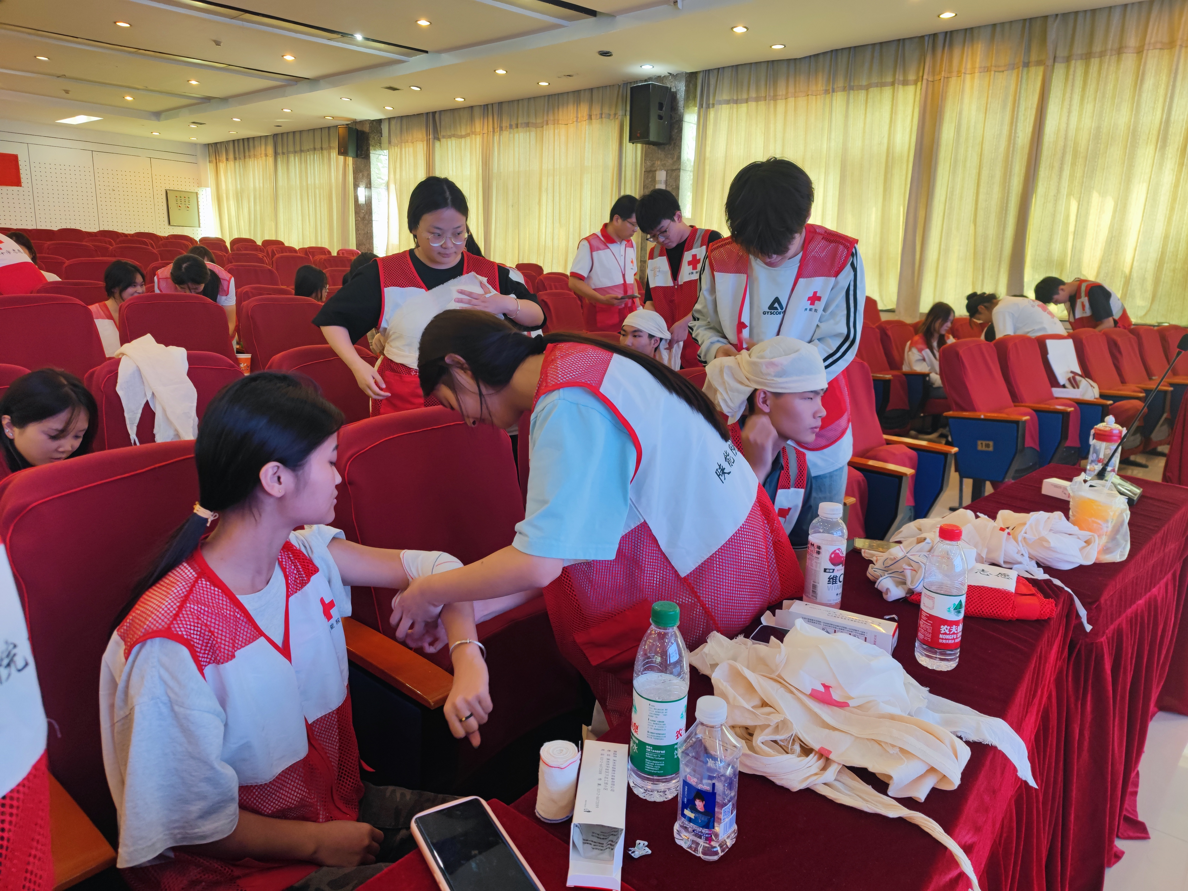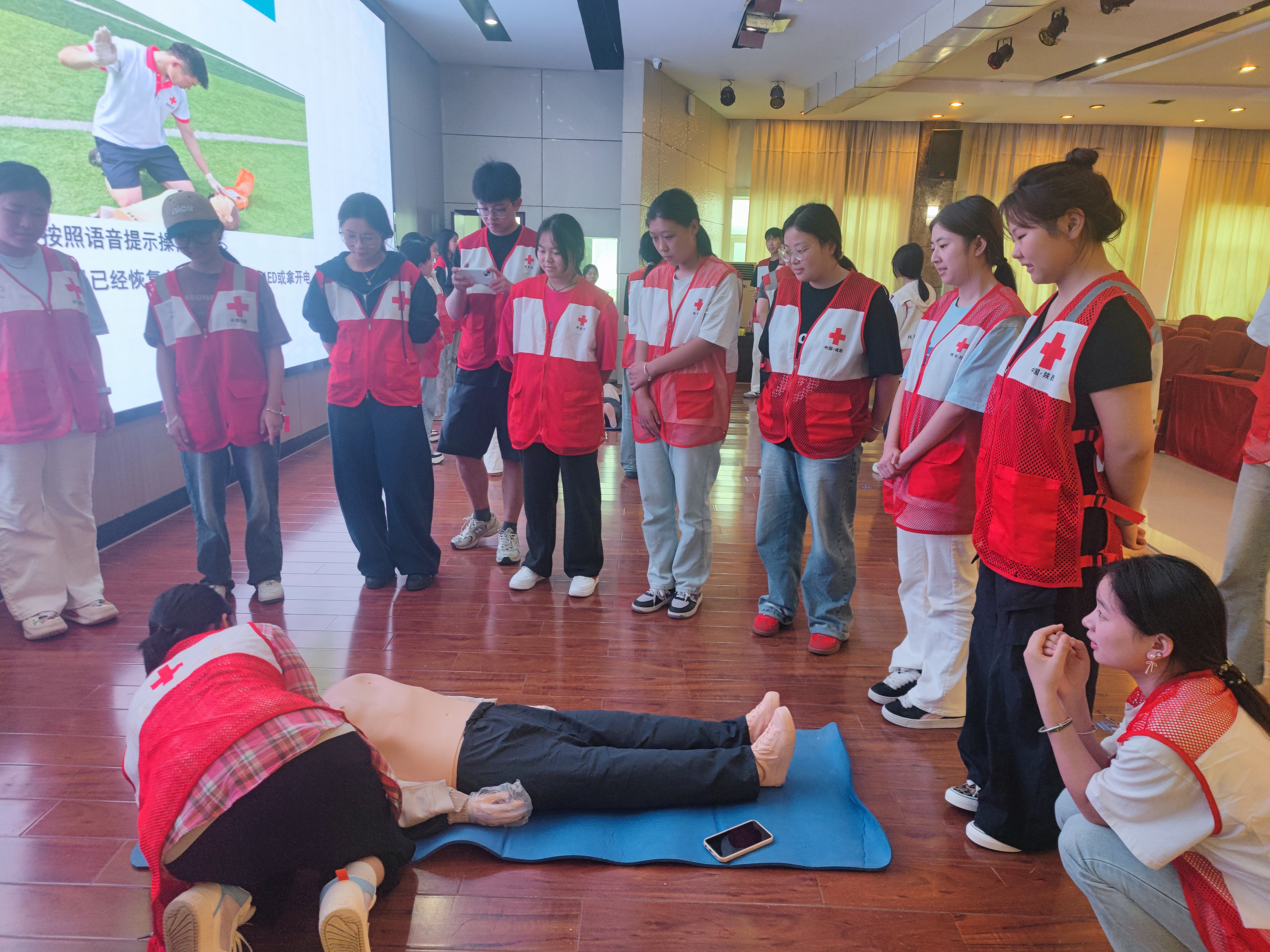 本次培训由咸阳市红十字会协调安排,晁明柱等3位老师担任培训任务。培训内容主要包括:“心肺复苏”、“AED的使用”、“创伤救护”“常见急症处理”等。通过理论+实操的授课方式,经过理论测试和实践考核合格者发放“红十字初级救护员证”。
