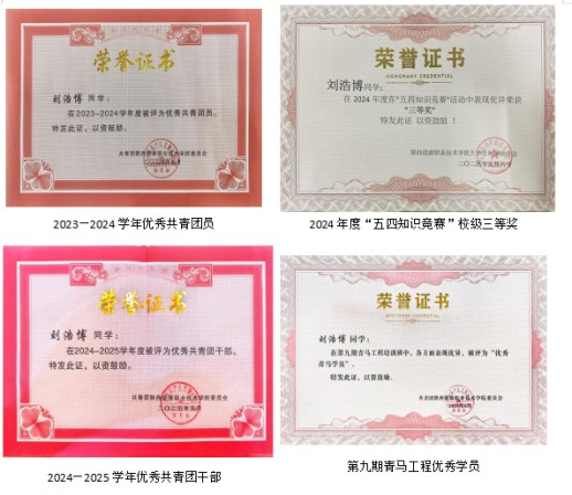 大学两年,“学思融合” 的深耕让刘浩博收获多重肯定,累计 20 余项荣誉证书,印刻着从 “专注技能提升” 到 “关注价值创造”、从 “个人成长突破” 到 “群体发展赋能” 的蜕变轨迹。