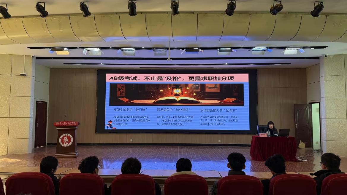 为助力我校学子精准攻克英语应用能力A、B级考试难关,夯实职场英语实用技能,12月10日 ,由校团委、学生联合会组织的英语A、B级考前辅导讲座在我校报告厅顺利举行。本次考前辅导特邀请人文与教育学院董银英副教授担任主讲,董老师围绕考试核心要点、应试技巧与备考规划展开深度讲解,300余名备考学生到场聆听,现场学习氛围浓厚。