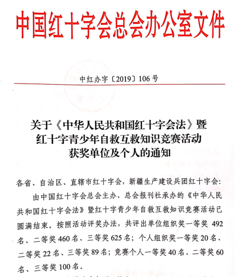 近日,中国红十字会总会发文,对2019年全国红十字知识竞赛活动获奖单位及个人进行表彰,根据《关于<中华人民共和国红十字会法>暨红十字青少年自救互救知识竞赛活动获奖单位及个人的通知》(中红办字〔2019〕106号),我校荣获“单位组织一等奖”,是陕西省获此殊荣的唯一一个高职院校,也是我校连续3年参加此项竞赛活动,获得的最佳成绩。