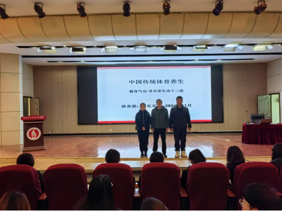 本次“中国传统体育养生”公开讲座是根据《中国传统体育养生》理论课程以及课程思政示范课程建设的要求举办的,讲座以“导引养生功十二法”为基础,重点讲解了导引养生功十二法的理论基础、文化内涵、健身功效及其功理作用。