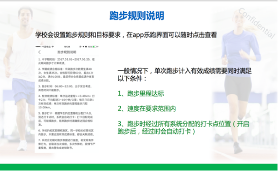 12、为保证锻炼效果,禁止任何作弊行为,包括使用交通工具、替人代跑等行为,乐跑后台会根据跑步分段配速、轨迹信息以及手机ID变更等情况分析作弊行为,一经核实将取消本学期体育成绩,并在学校范围通报。同时也欢迎同学们匿名监督和举报。