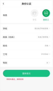 2)、认证不通过(我的界面会显示“审核未通过”,修改信息后重新提交)