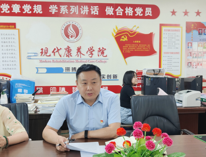 5月27日上午,现代康养学院在409会议室召开学院党总支理论中心组学习(扩大)会议,学院全体党员以线上线下相结合形式参加会议,会议由学院党总支书记唐恭贺主持。