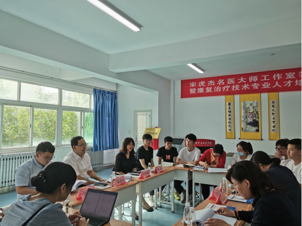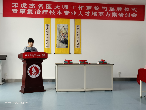 为推进我校双高建设,增加多层次的师承教育项目,扩大师带徒范围和数量,积极发挥临床名医大师的重要作用,2021年5月26日,我校在第二实训楼302康复专业实训室隆重举行了宋虎杰名医大师工作室签约揭牌仪式暨康复治疗技术专业人才培养方案研讨会。西安中医脑病医院院长宋虎杰、副院长杜晓刚等一行4人受邀出席,陕西能源职业技术学院校长朱忠军、副校长赵新法、教务处长牛西武、医学院党政领导及康复专业全体教师和20名学生代表等参加了此次仪式,仪式由副校长赵新法主持。