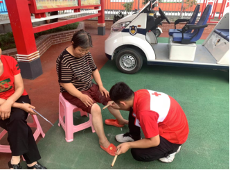 仪式结束后,实践团在营上村活动广场开展志愿服务活动,不仅为老人们进行血压测量、按摩推拿以及艾灸等方面的服务,还为村民奉上精心准备的节目,并赠送自制手工皂。