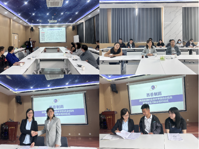 西岳制药公司经理党英对我校现代康养学院师生的到来表示了热烈欢迎后,带领高惠霞一行人参观了企业的化验室、展览厅、生产车间,党经理详细介绍了公司的组织架构、人才需求、岗位设置、员工的成长空间以及福利待遇等。高惠霞就学校的发展历史、办学特色、学生特点等情况也做了详细介绍,她表示学院要深入各大企业进行更加深入的沟通和交流,学院要与社会资源互补,有针对性地为社会培育更好人才,校企应该加强合作共育人才,根据社会需求共同开发应用型人才培养课程,提高学生适应岗位的能力。任春晓表示校企合作要多维度开展,让企业走进学校宣讲,帮助学生提前了解社会需求,做好求职准备,助力学生更好就业。最后双方就进一步加强合作达成共识,签订了《校企合作人才供需就业意向书》,同时有两名2020级药学专业的学生完成了现场就业签约。