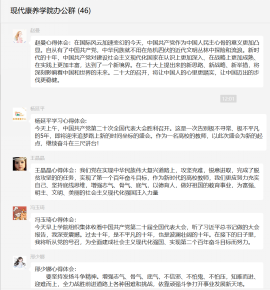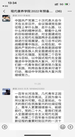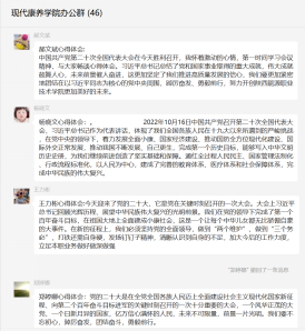 在大会直播期间,我院师生都认真听取习近平总书记的工作汇报,部分教师们边看边做记录,充分体现了教师们对我党的二十大开幕的关心和重视。上午大会汇报一结束,大家就在学院办公群里展开了热烈地交流讨论,老师们感想如下: