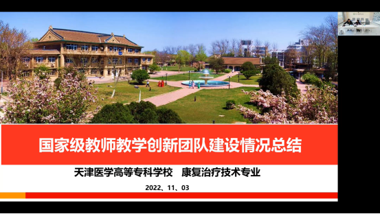 天津医学高等专科学校国际教育学院院长、医学护理学院副院长、创新团队主持人许有华发言,从创新团队基本情况、创新团队建设的目标定位、工作开展情况,建设过程中存在的问题四个方面汇报了创新团队建设情况,分享了天津医学高等专科学校教师教学创新团队在“加强师德师风建设,打造德技双馨创新团队”“探索团队建设运行机制,保障团队可持续发展”“加强课程建设,提升团队的“三教”改革能力”“以传统康复技术的“鲁班工坊”建设为核心,提升团队国际化水平”等方面取得成绩及经验做法等。