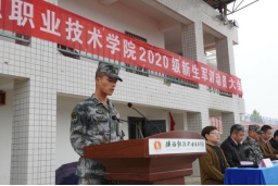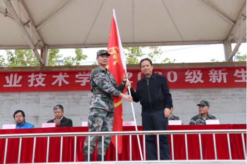 最后,校党委书记令狐培选向军训承训单位授旗,并宣布军训开始。2020年新生军事训练正式拉开帷幕。