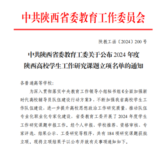 6月5日,中共陕西省委教育工委发布了《关于公布2024年度陕西高校学生工作研究课题立项名单的通知》,我校煤化学院辅导员常露主持的《美育浸润视域下煤炭类高职学生工匠精神培育的路径探析》、学生处学生资助管理中心干事刘阳主持的《数字轼能高校辅导员思政育人路径的探索与研究》、康养学院学工办主任赵晨萱主持的《大学生劳动教育的实践与创新研究—以陕西能源职业技术学院为例》等3项学生工作课题研究项目获得省级立项。