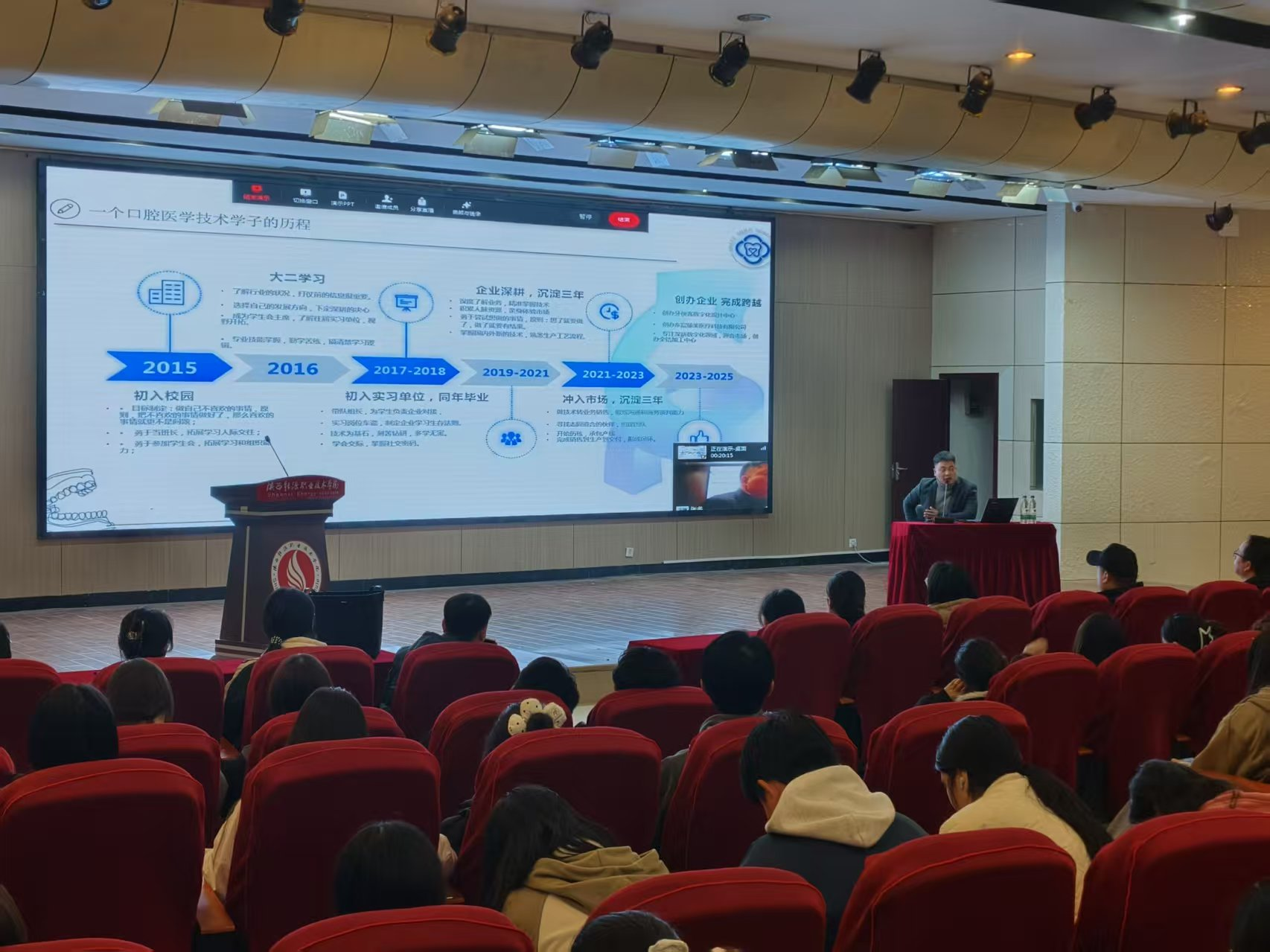 11月6日,医学技术学院在第一实训楼六楼报告厅成功举办 “承榜样之光,拓就业之路——优秀校友与你面对面”职业生涯规划教育暨就业教育宣讲会。本次宣讲会特邀陕西东宸臻美医疗科技有限公司总经理程东雷与数字化设计中心主管袁孟轩两位优秀校友倾情分享,采取线上线下相结合方式进行,医学技术学院党总支副书记张多、学工办主任蒋文、班主任以及全体口腔专业学生参会,活动由张多主持。