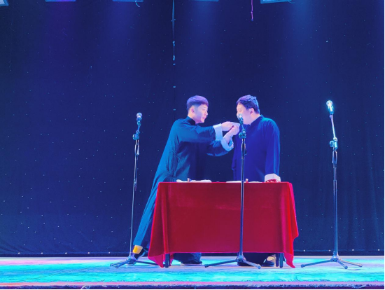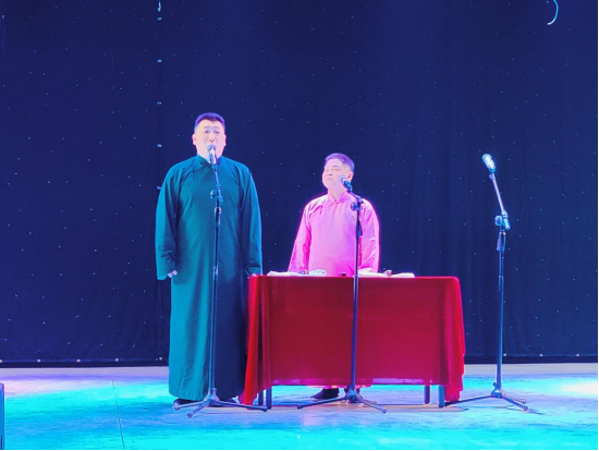 演出在相声《回桃》中拉开序幕,表演者杜雨涵和刘博一出场就迅速活跃起现场气氛。之后,相继演出了《酒令》《歌曲漫谈》等相声节目,各位演员妙语连珠、惟妙惟肖、精彩绝伦的表演引得现场掌声连连,将气氛不断推向高潮。