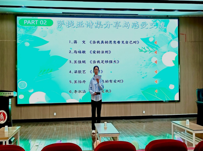 马瑞敏、王佳妮等6位师生代表依次深情朗诵《当我的内心足够强大》《当我真的愿意看见自己时》《爱的法则》等经典诗篇。他们结合自身学习、生活经历,分享了对“自我接纳”“爱的能量”“成长勇气”的独特感悟。
